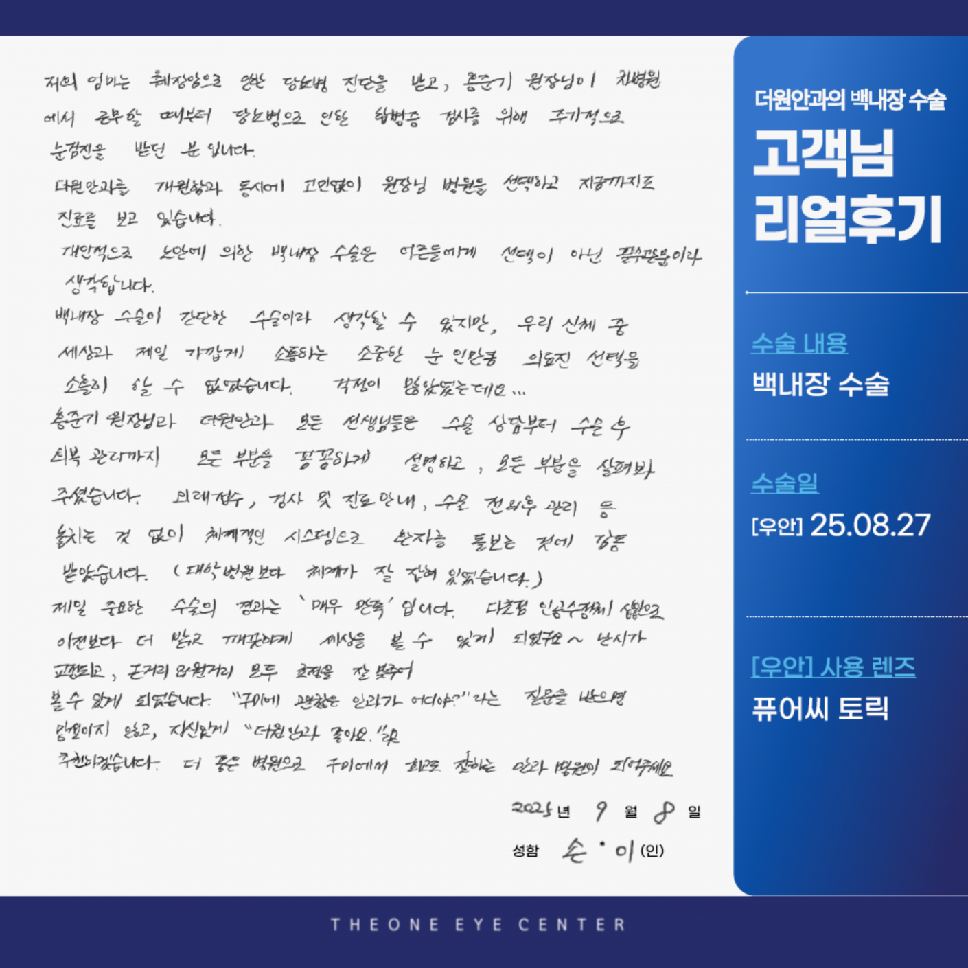 노안,백내장 더원안과 백내장 수술 후기_손00님